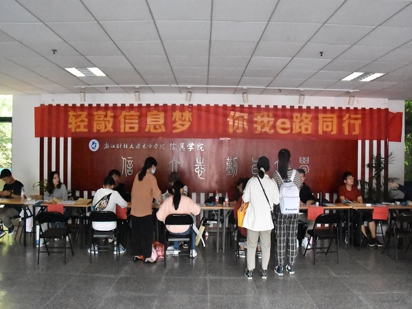 学院志愿者为迎接新生的到来一直悉心等待在各个路口,他们身穿蓝色的志愿者服装或是挂着信息学院的工作证,紧张而忙碌,指引着一批批新生从三号实验楼到寝室,搬运行李,熙熙攘攘的人群中,信息学院别具一格。在三号实验楼中,新生们陆续报道。班助们认真地为新生准备每一项入学所需物品,提供各种咨询,解答种种疑惑。信息学院别具一格的新生照片墙和迎新海报墙也成为众多新生打卡的首选。