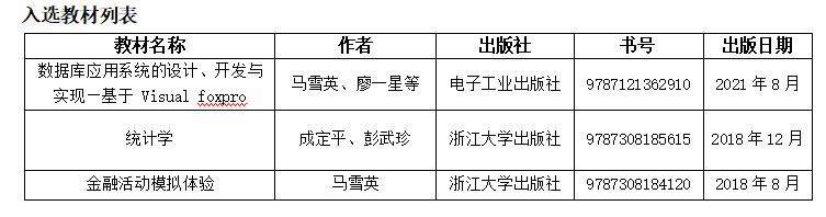 近日,浙江省高等教育学会发布《关于公布浙江省普通高校“十三五”新形态教材建设项目首批认定结果的通知》,我院教师主编的3部教材入选。分别为马雪英、廖一星等主编的《数据库应用系统的设计、开发与实现—基于 Visual foxpro》,成定平、彭武珍主编的《统计学》,马雪英主编的《金融活动模拟体验》。