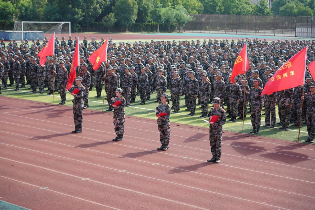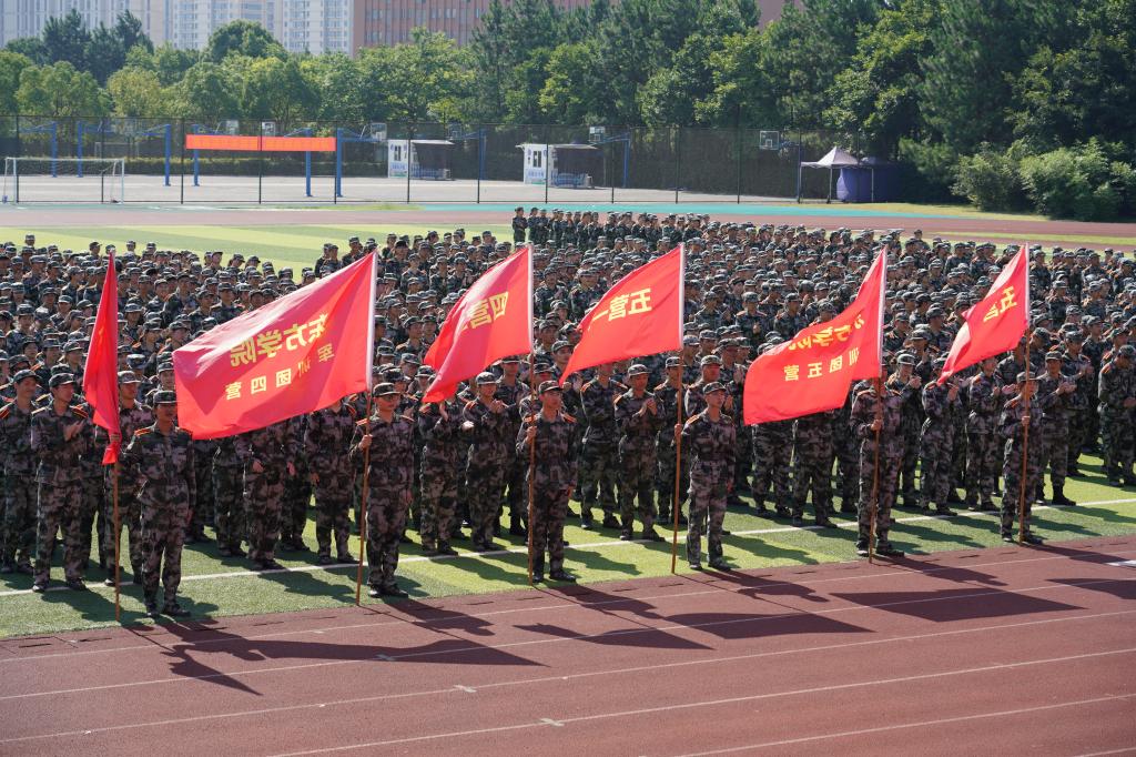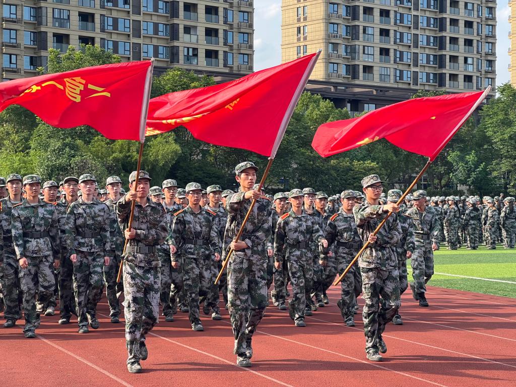 在雄壮的阅兵进行曲中,参训学生们踏着整齐有力的步伐,带着洪亮的口号,依次走过主席台接受检阅。