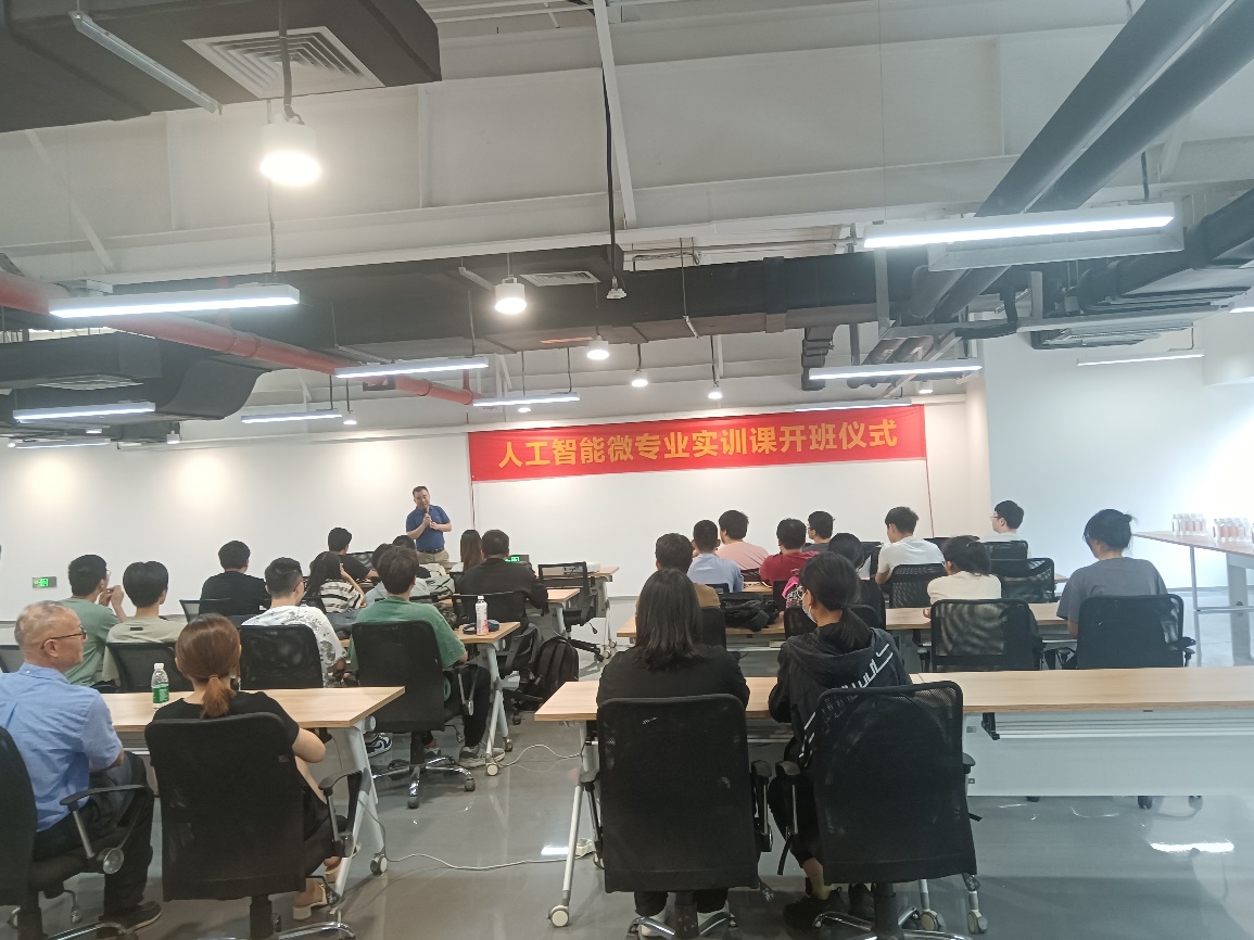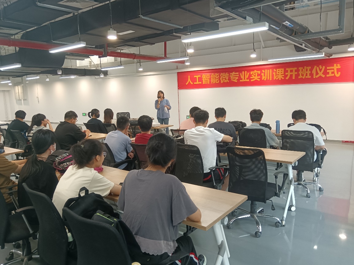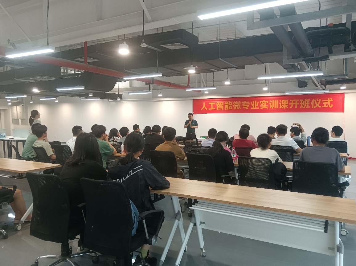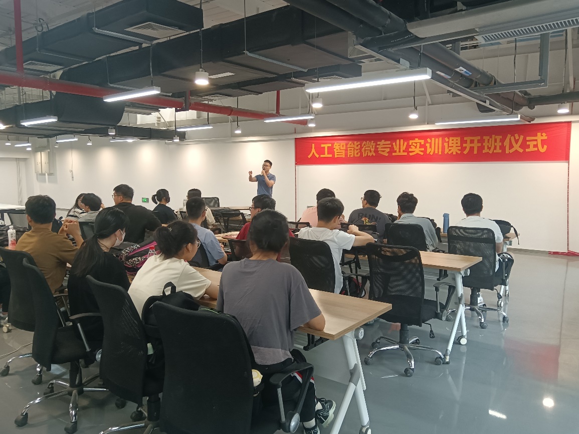 仪式上,郝瑞吉总经理首先对我院师生表示了热烈的欢迎,并简要介绍了人工智能产业学院、园区及授课老师的相关情况,同时对参加本次实训的同学提出了期望。