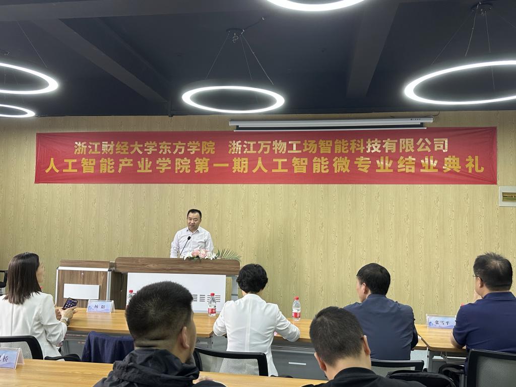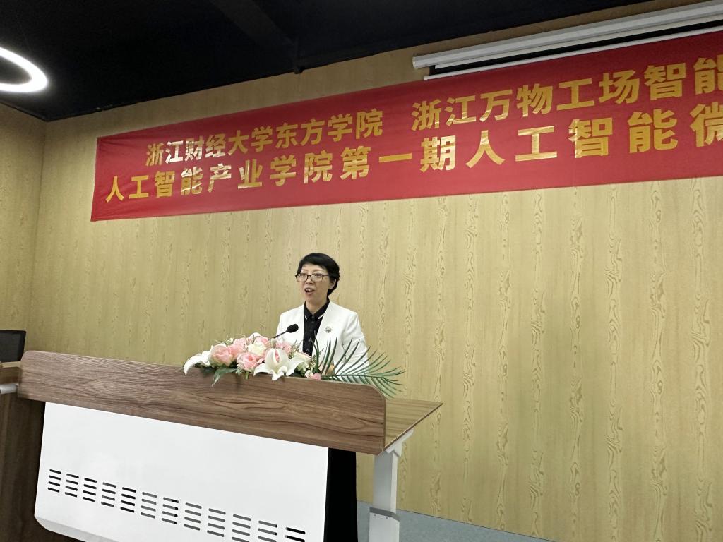 结业典礼在庄严而又热烈的氛围中进行。首先,马雪英院长代表学院发表了热情洋溢的讲话,她对同学们在人工智能领域的努力和成果表示肯定,对万物工场在人工智能微专业建设中的提供的帮助表示感谢。她强调了人工智能在未来的重要性,鼓励同学们继续深入学习和实践,将所学知识应用于实际工作中,她希望同学们积极探索,在未来科技领域中勇往直前,实现梦想。