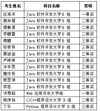 由工业和信息化部人才交流中心主办的第十五届蓝桥杯全国软件和信息技术专业人才大赛个人赛省赛于4月21日举办,来自全国1900多所高校的23万名选手报名参加了个人赛的角逐。我校共有35名同学积极报名参加了包括Java软件开发、Web应用开发、C/C++程序设计和Python程序设计4个比赛项目,共有15名学生获奖,具体情况如下: