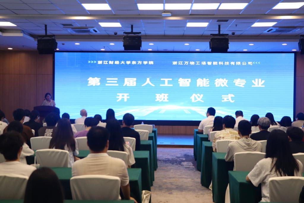 揭牌仪式后,信智学院举行第三届人工智能微专业开班仪式。杨丽霞副院长在开班仪式上致辞,并向浙江万物工场表示了由衷的感谢。她强调,人工智能微专业作为学院“新财经战略”的重要组成部分,致力于培养跨学科、具有竞争力的高素质应用型人才。杨院长分享了微专业前两届的成功经验,以及与万物工场的深度合作模式,让学生不仅掌握了人工智能核心技能,还在实践中提升了竞争力,部分学生因此在升学和就业中取得了显著优势。最后,她还对信智学院的未来发展提出了具体要求,鼓励学院在加强专业内涵建设、推进“人工智能+”专业改造、深化产教融合等方面做出更多努力。
