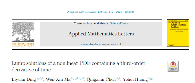 我院陈庆仙老师近期在外文期刊《Applied Mathematics Letters》上发表论文《Lump solutions of a nonlinear PDE containing a third-order derivative of time》。陈老师近年聚焦于高阶偏微分方程的特殊类型孤子解lump解的求解,该期刊为相关领域内的顶级期刊,被SCI一区收录。
