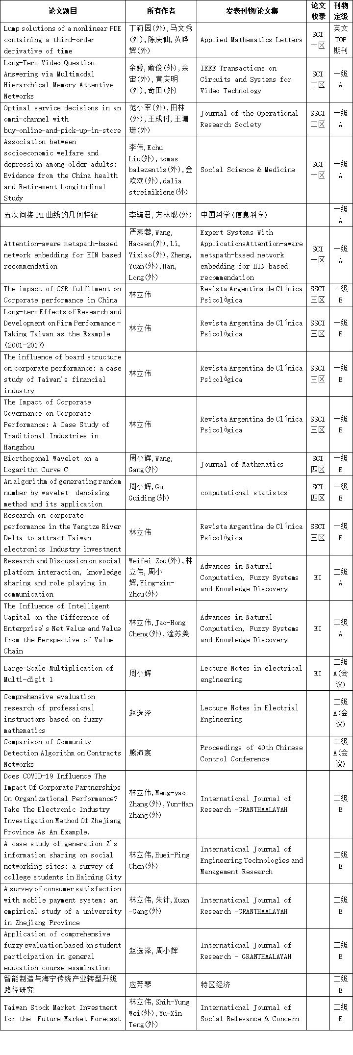 学院历来高度重视科研工作,加强团队建设,提高高质量成果产出,以高质量科研工作、高水平科研成果带动学院内涵式发展。2021年截止当前,我院教师在各级各类期刊发表高水平论文36篇,其中英文TOP一篇,1级A五篇,1级B七篇,2级A五篇,2级B六篇。成果详见附表。