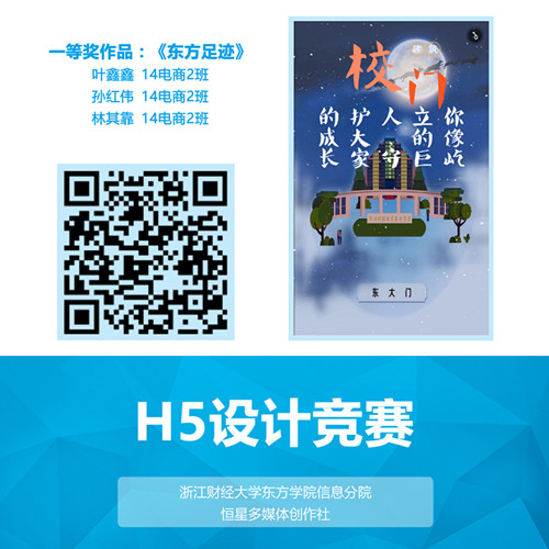 为丰富和活跃校园文化氛围,信息分院举行我院首届H5设计竞赛,围绕“我眼中的东方”和“我与我的专业”两个主题更好的宣传和展示学院风采及各专业特色。H5是集文字、图片、音乐、视频、链接等多种形式的展示页面,具有精美的展现形式、灵活的动画效果和强大的交互能力。随着互联网的飞速发展,H5作为一种易操作、易传播的形式风靡网络,在微信等社交平台大放异彩。下面给大家欣赏本届H5设计竞赛一等奖和二等奖作品,可以使用手机扫二维码在移动端观看,也可点击链接在网页版观看。希望在成果展示的同时给大家开阔思路,来年有更多东方学子能够参与到H5设计竞赛中,一展风采。