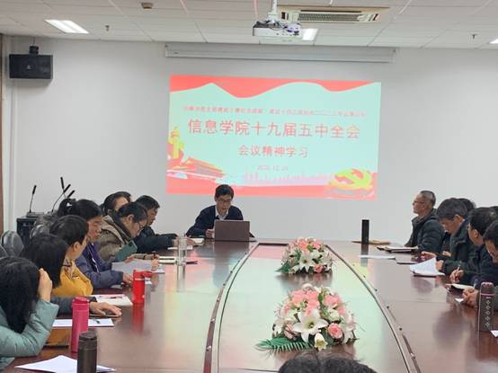 2020年12月29日下午,信息学院党总支于S3-504会议室,召开全体教师党员专题理论学习会,学习十九届五中全会会议精神。会议由党总支书记费松天主持。