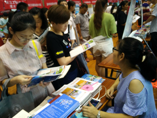 2018年7月17日我院由信息分院淦苏美和王硕两位老师组成的招生宣传工作组赴嘉兴开展招生宣传工作。本次招生宣传会安排在嘉兴学院体育馆内,参会学校众多,不仅有来自省内的大学,还有多所来自河北、山东和黑龙江等外省高校,招生咨询现场十分火爆。